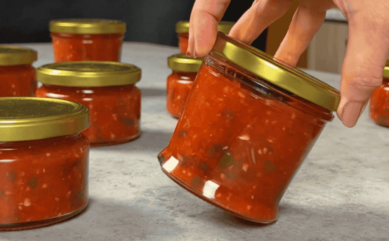 Готовий гарячий соус перекладаю в стерилізовані банки, герметично закриваю кришками, перевертаю догори дном і вкутую ковдрою до повного охолодження. Такий продукт може зберігатися за кімнатної температури до наступного врожаю або навіть довше.